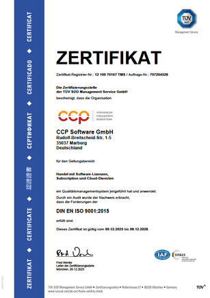 CCP Software GmbH nach Norm „DIN EN ISO 9001:2015 Qualitätsmanagementsysteme – Anforderungen“ zertifiziert.